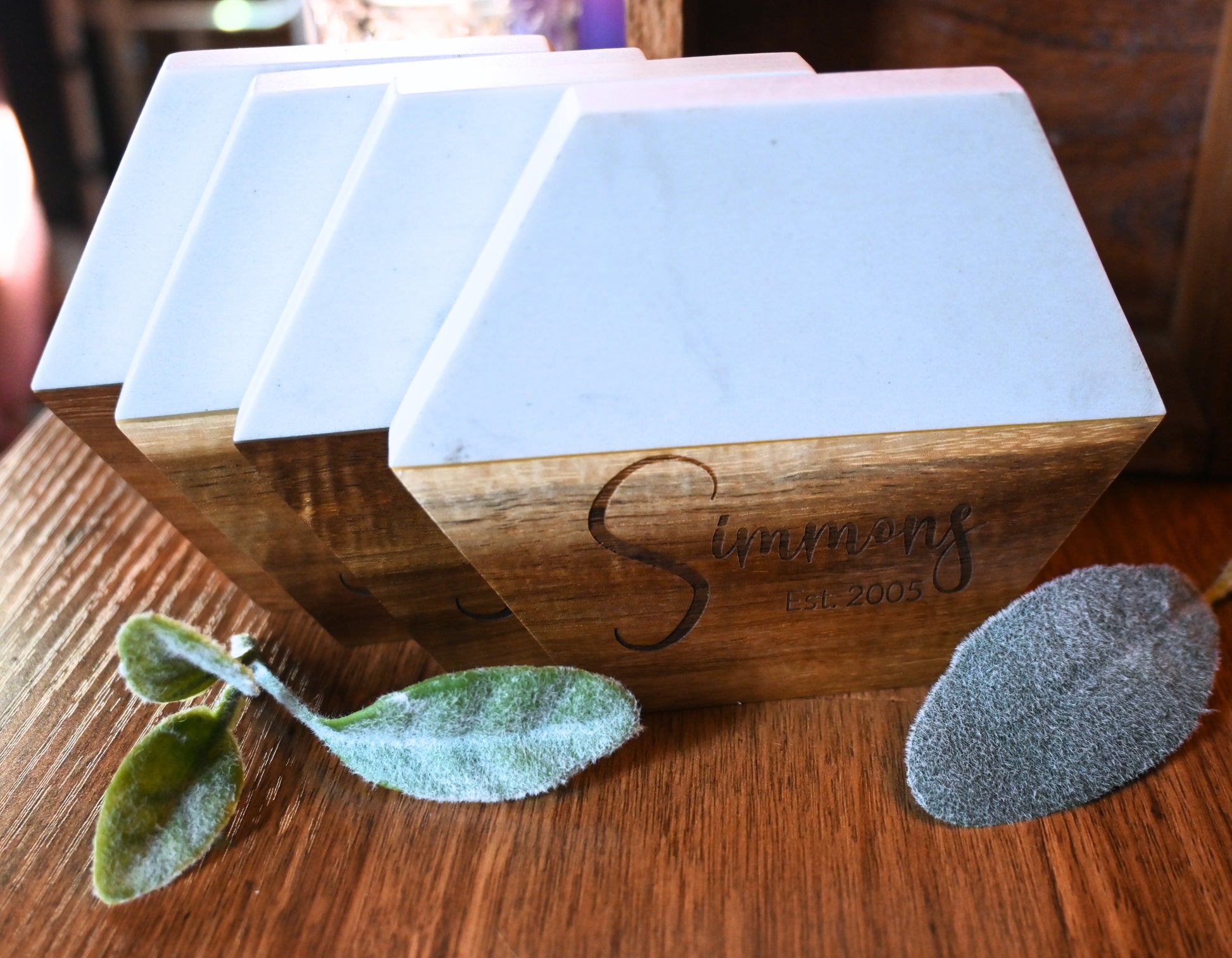 Elevate your space with our Personalized Coasters, perfect for adding a custom touch to any home or office. Available in all-wood or a wood and marble-like combination, these coasters offer a stylish and durable way to protect surfaces while showcasing your unique design.